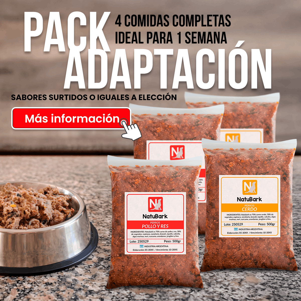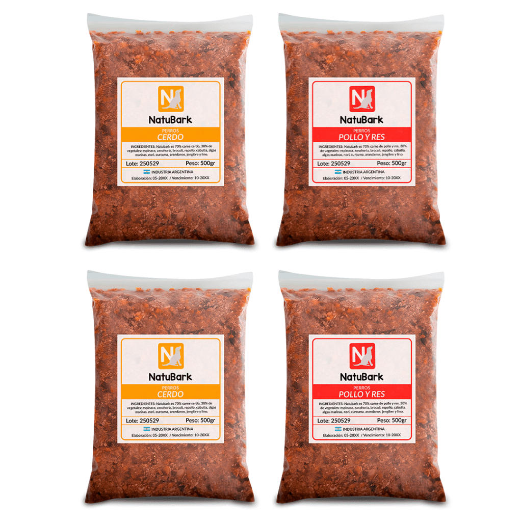 Darle a tu perro la mejor nutrición nunca fue tan fácil. Preparamos Natubark en prácticos formatos para que elijas el que mejor se adapta a tus necesidades y al tamaño de tu compañero. Nuestra única receta, llena de ingredientes frescos y naturales, está lista para transformar su salud desde el primer bocado.